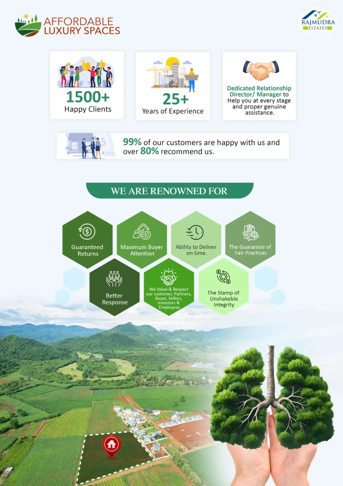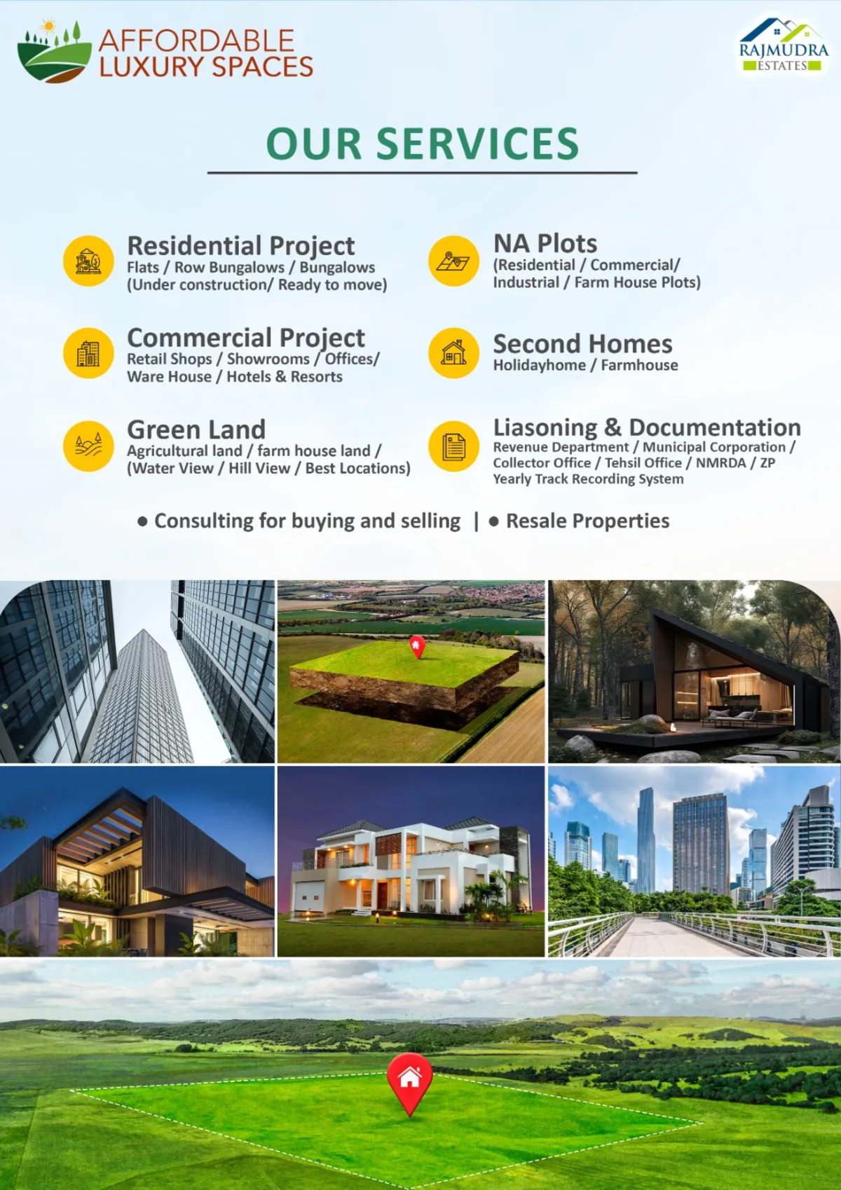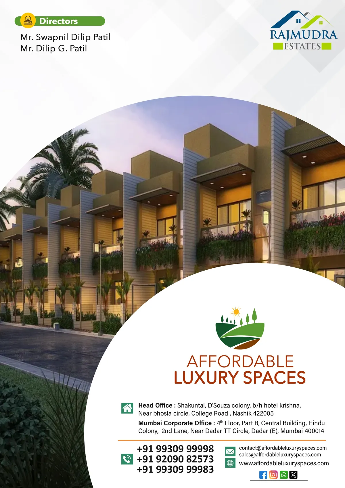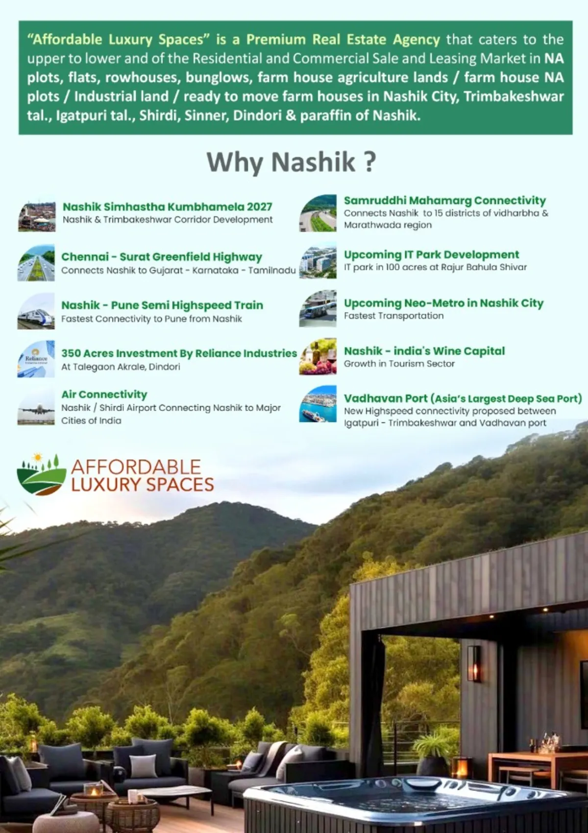 Affordable Luxury Spaces advises buyers, sellers, investors, and developers across Nashik, Trimbakeshwar, Igatpuri, Shirdi, Sinnar, Dindori, and the wider periphery — with transparent processes and end-to-end support.